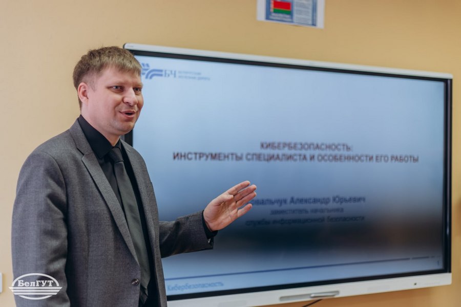 С приветственным словом перед студентами выступил начальник Службы информационной безопасности Управления Белорусской железной дороги Савчик Евгений Вячеславович, провел семинар заместитель начальника Службы информационной безопасности Ковальчук Александр Юрьевич.