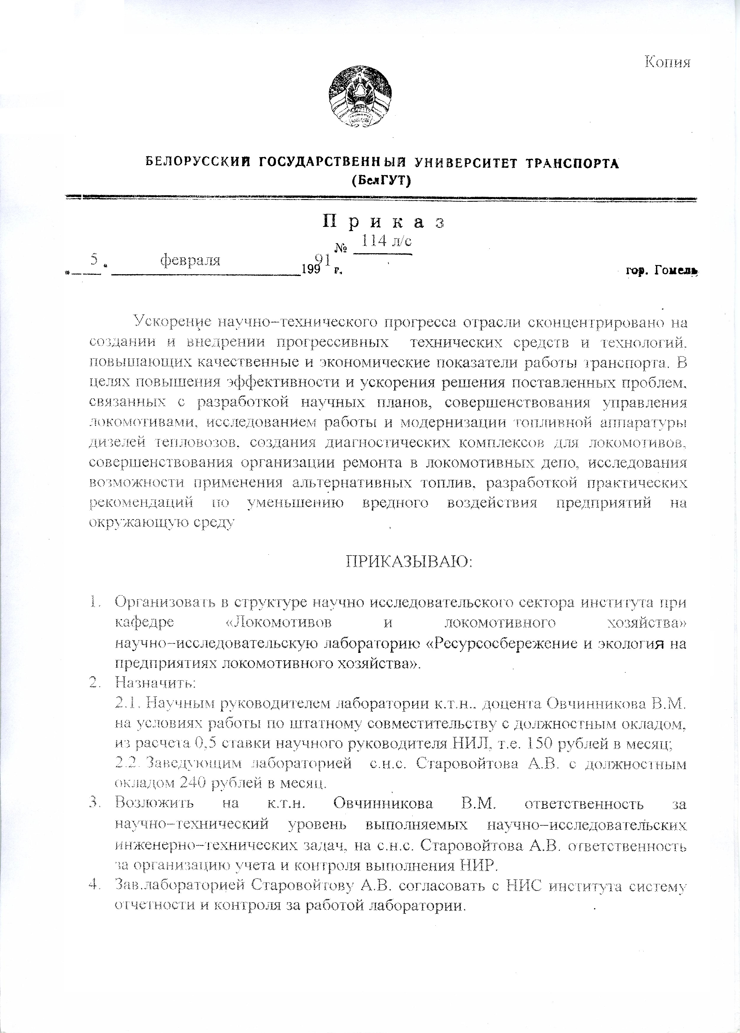 5 февраля 1991 года приказом № 114 ректора БИИЖТа была организационно оформлена научно-исследовательская лаборатория (НИЛ) «Ресурсосбережение и экология на предприятиях локомотивного хозяйства». Лаборатория развивалась, меняла структуру, становилась одной из самых авторитетных организаций в республике в своей сфере деятельности. В 2000 году, в связи с расширением сферы деятельности НИЛ, была преобразована в научно-исследовательский центр экологической безопасности и энергосбережения на транспорте (НИЦ ЭиЭТ)..