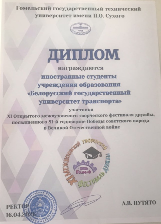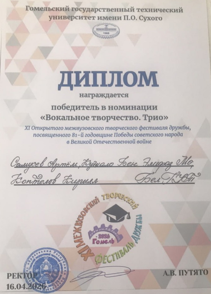 Старания и искренность наших ребят не остались незамеченными принимающей стороной. Администрация Гомельского государственного технического университета имени П.О. Сухого высоко оценила уровень выступления делегации БелГУТа. По итогам фестиваля всем участникам были вручены почетные грамоты, памятные призы и ценные подарки. Это стало не только приятным сюрпризом, но и подтверждением того, что профессиональный подход к творчеству всегда вознаграждается по достоинству.