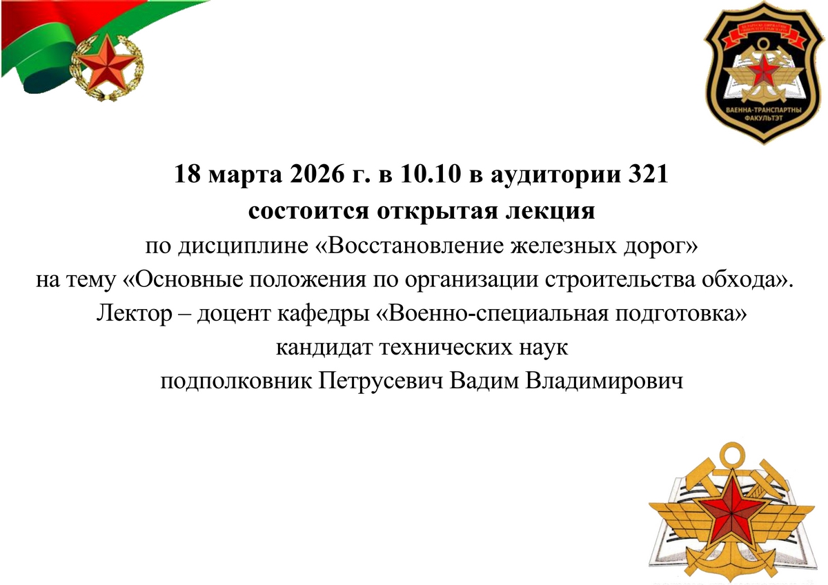 18 марта 2026 г. в 10.10 в аудитории 321 состоится открытая лекция по дисциплине «Восстановление железных дорог» на тему «Основные положения по организации строительства...