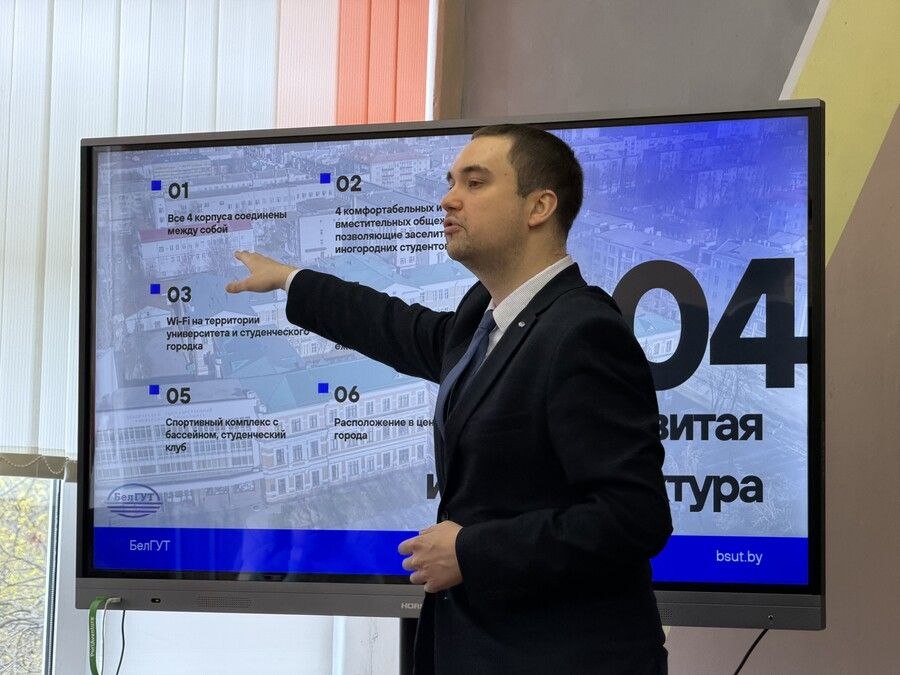 В каждой из точек маршрута начальник отдела профориентационной работы и довузовской подготовки БелГУТа Михаил Страдомский подробно рассказал старшеклассникам о преимуществах обучения в транспортном вузе. Он обратил внимание на уникальность университета. БелГУТ – единственный вуз в Беларуси, который готовит специалистов с высшим образованием для железнодорожного транспорта.