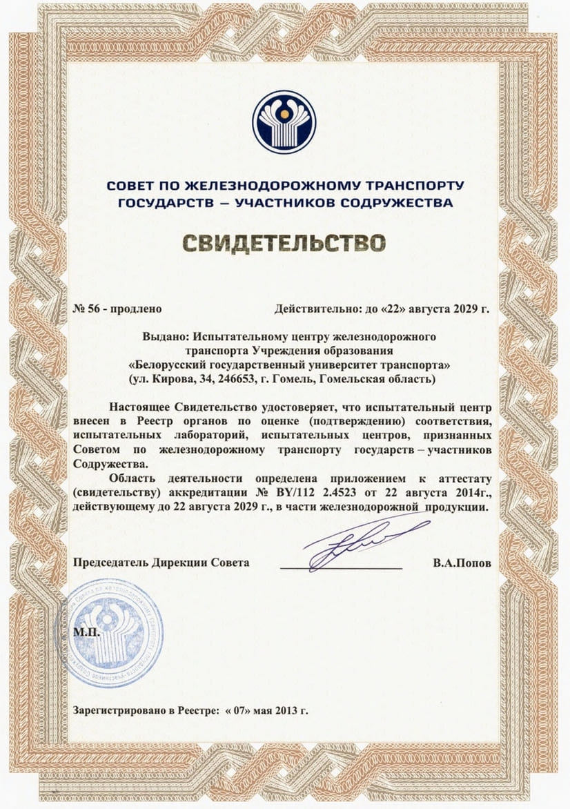 Испытательный центр железнодорожного транспорта БелГУТа (ИЦ ЖТ БелГУТа) аккредитован в Национальной системе аккредитации Республики Беларусь (аттестат аккредитации № BY/112 2.4523 от 22 августа 2019) и включен в Единый реестр органов по сертификации и испытательных лабораторий (центров) Евразийского экономического союза.